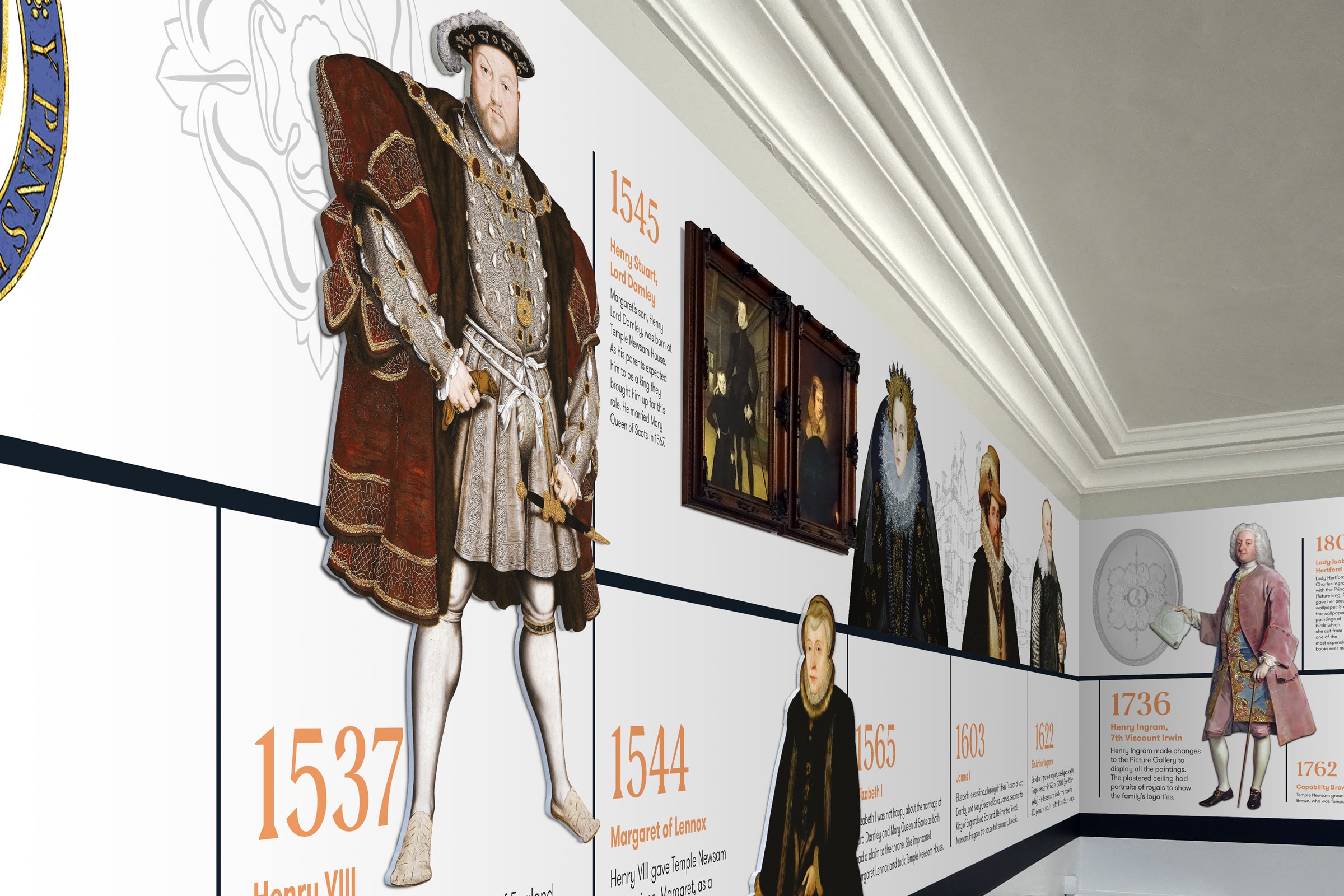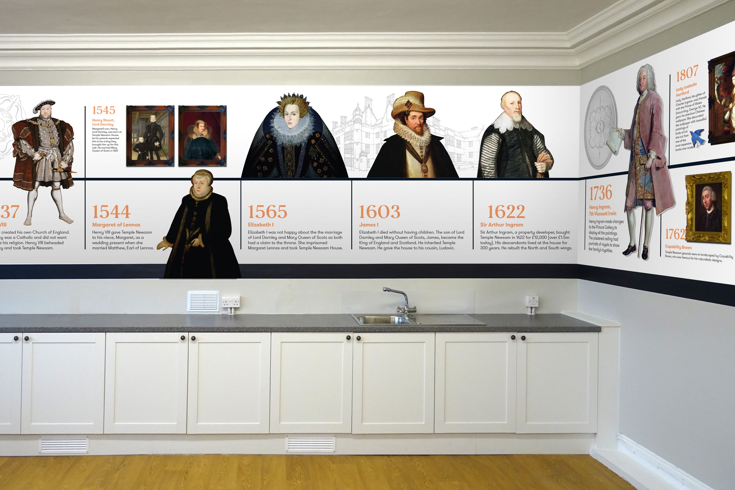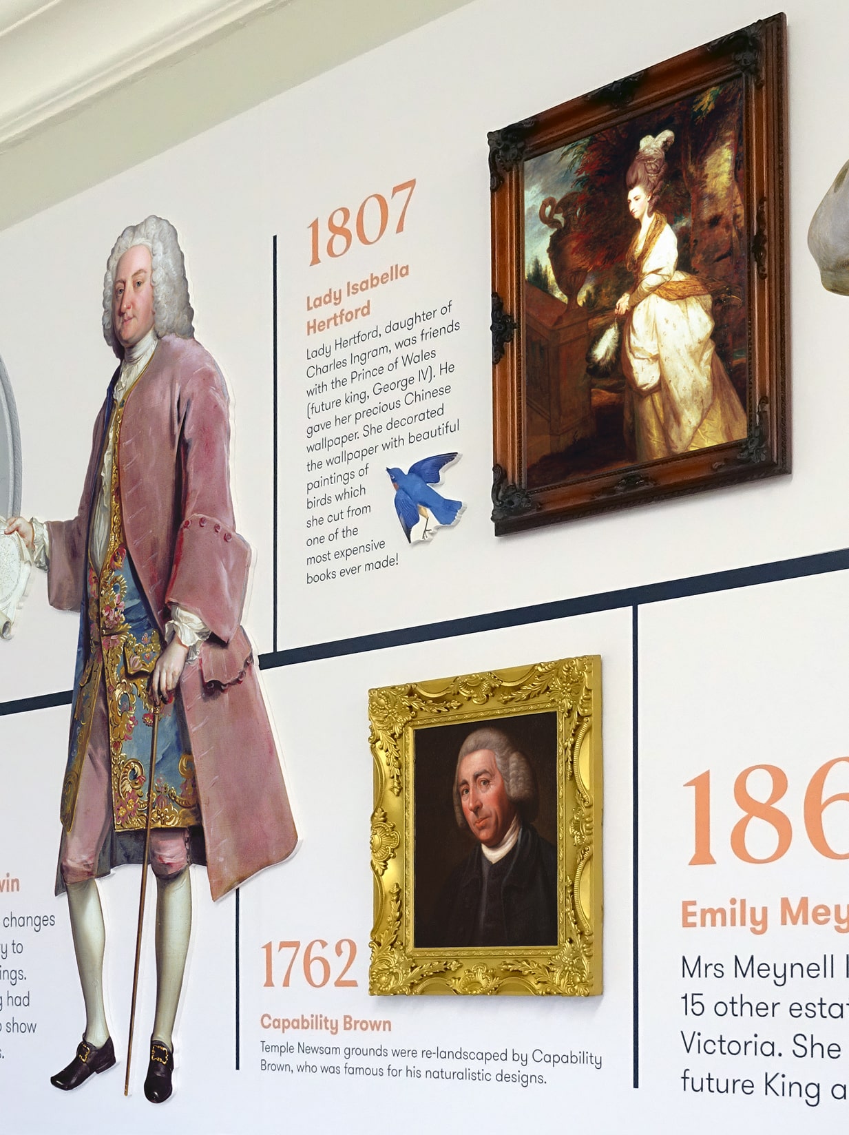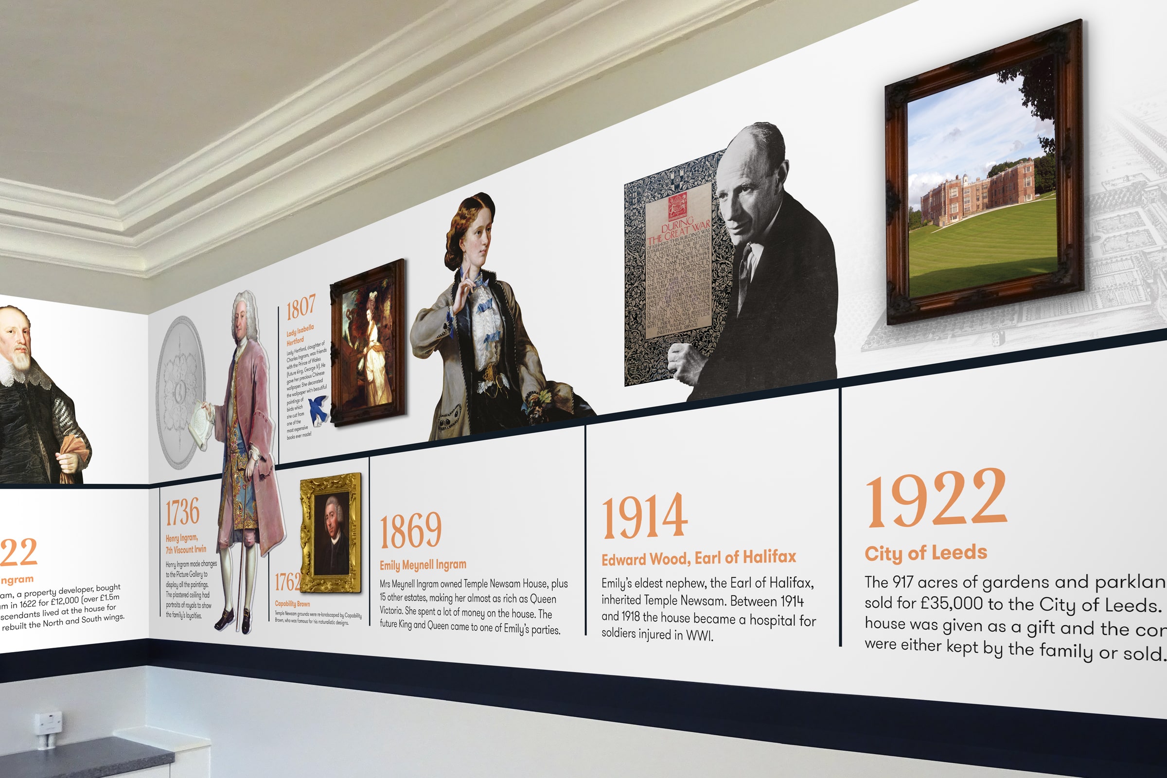 In close collaboration with the learning team, we conceived and designed a striking historical timeline that brings the former owners stories and collections to the fore. This immersive, 10-metre wall graphic, spans two walls and immediately captivates visitors, serving as the room’s centre piece.